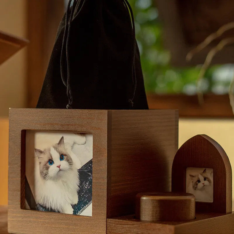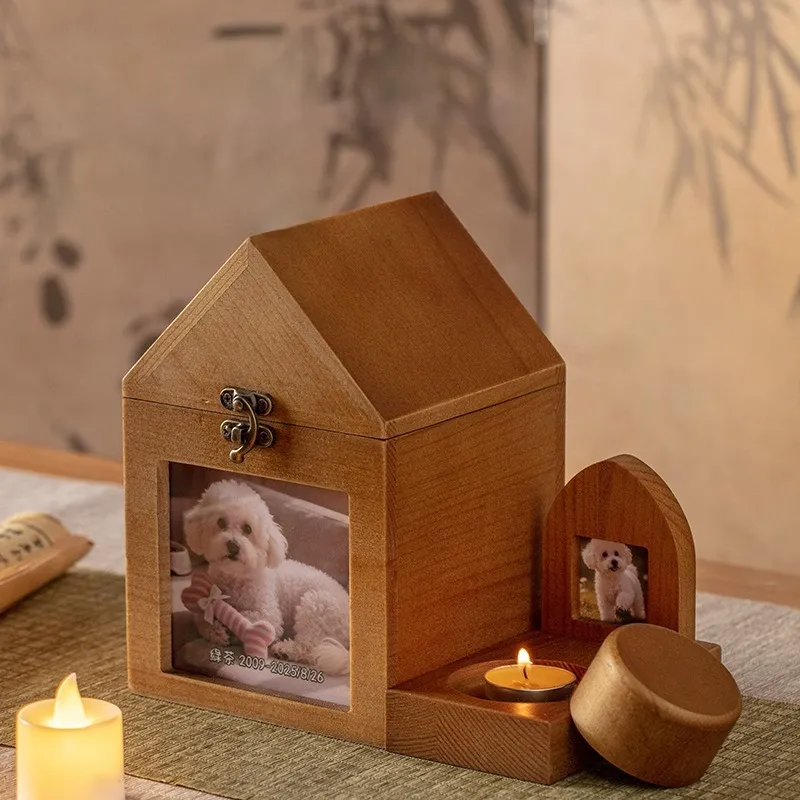 Keep your beloved companion close with this wooden memorial house urn. Thoughtfully crafted from natural wood, it offers a peaceful final resting place, holding cherished memories with warmth and dignity.